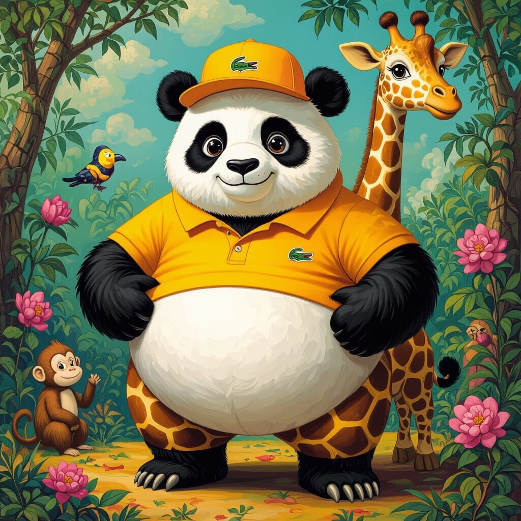 This image shows a bizarre creature with mismatched animal parts and human features. It is wearing a Lacoste polo shirt and hat, rendered in a vibrant, whimsical, cartoonish style.