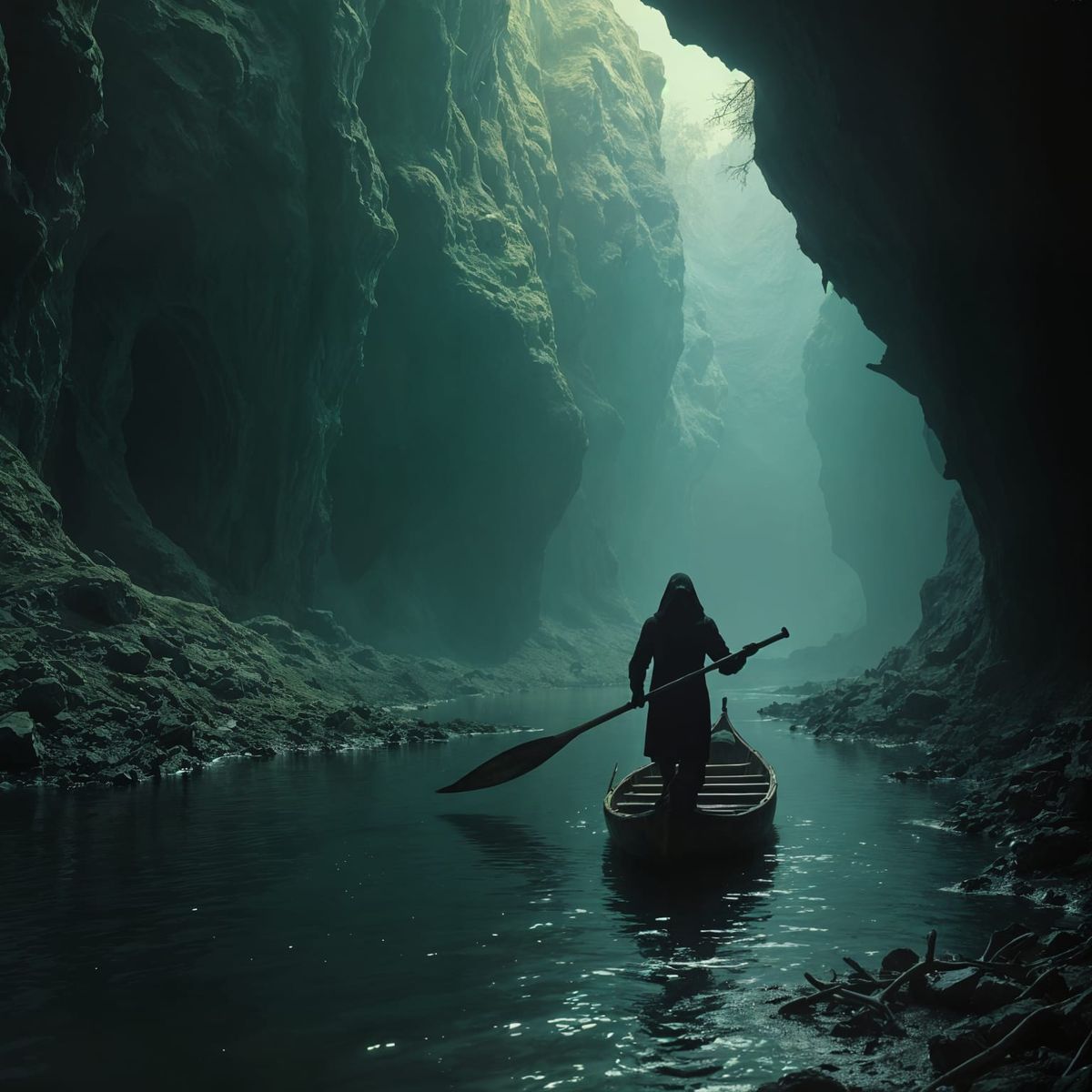 This haunting image shows a gondolier navigating a subterranean river past eerie cliffs, grotesque carvings, and skeletal remains, lit by a bioluminescent glow in a hyperrealistic, detailed scene inspired by dark art masters.