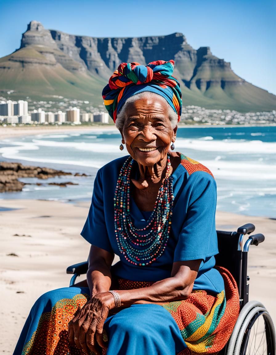 This image depicts an elderly Xhosa woman with a warm smile, seated in a wheelchair on Blouberg beach. She's adorned in a vibrant wax-print maxi-skirt and colourful headwrap, with Table Mountain visible in the distance.