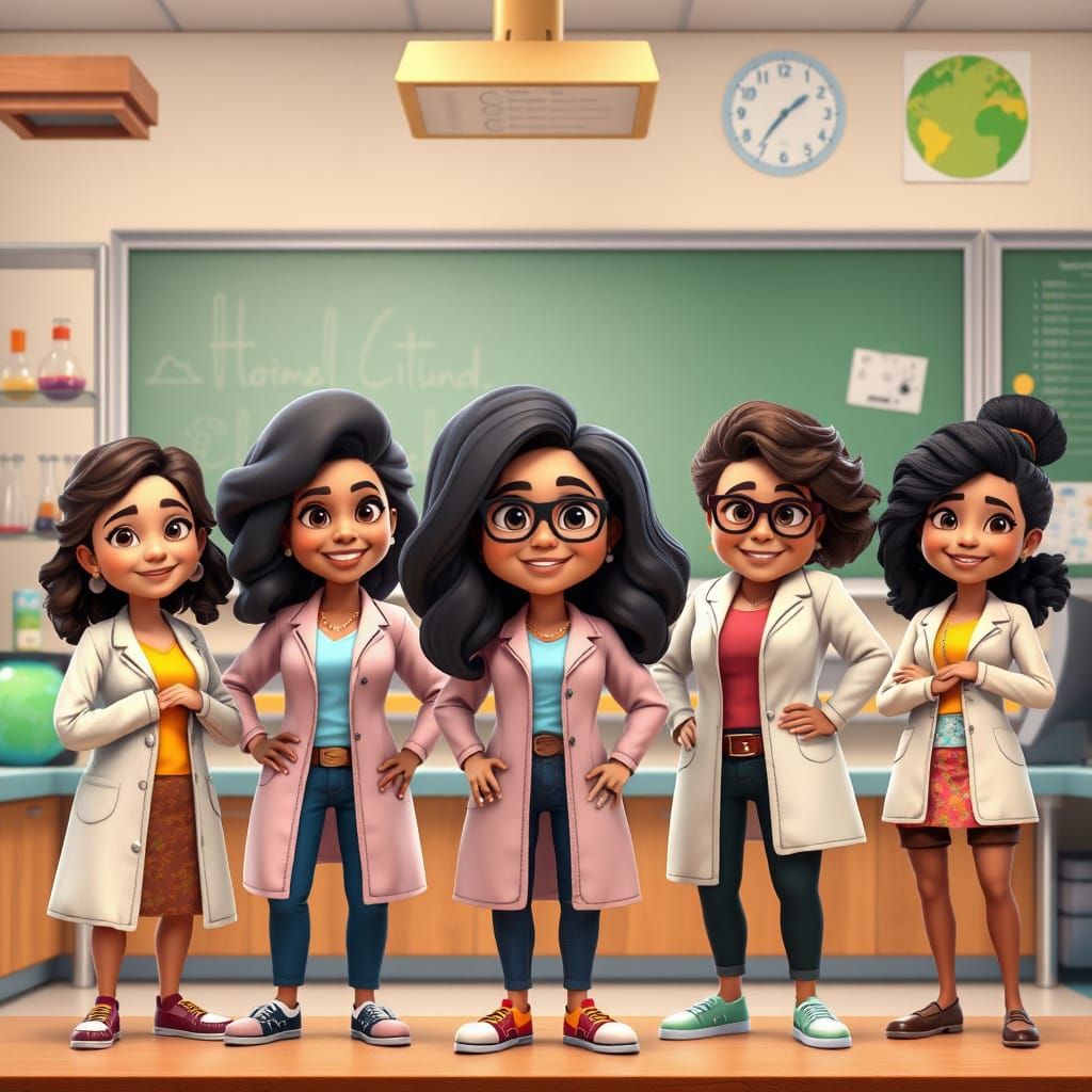 This image shows five Puerto Rican female science teachers in a vibrant classroom. The characters are depicted in a Pixar-like 3D style, with unique hairstyles, colors, and exaggerated features.