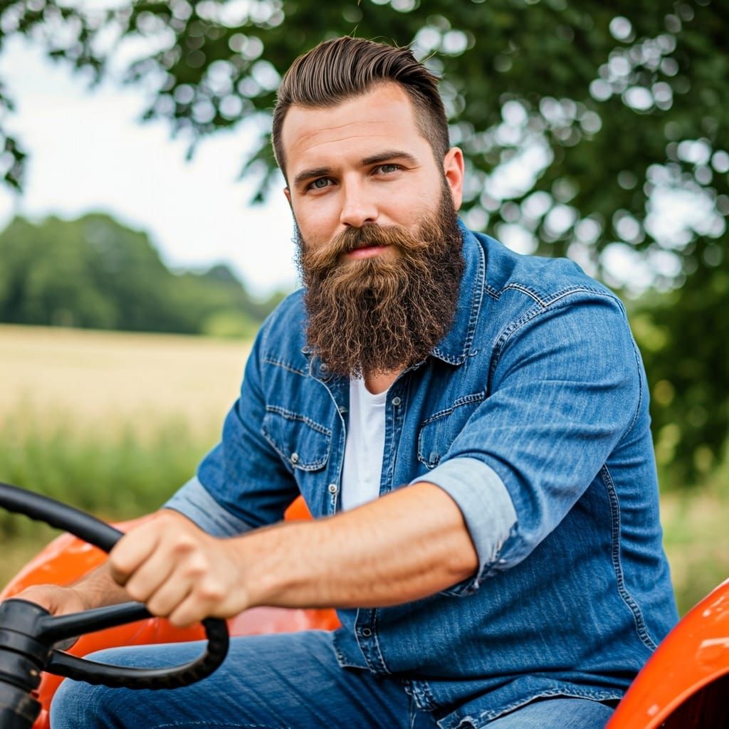 A striking picture of a shirtless, bearded farmer driving a tractor. The image captures a rural scene with a focus on the farmer's rugged appearance.