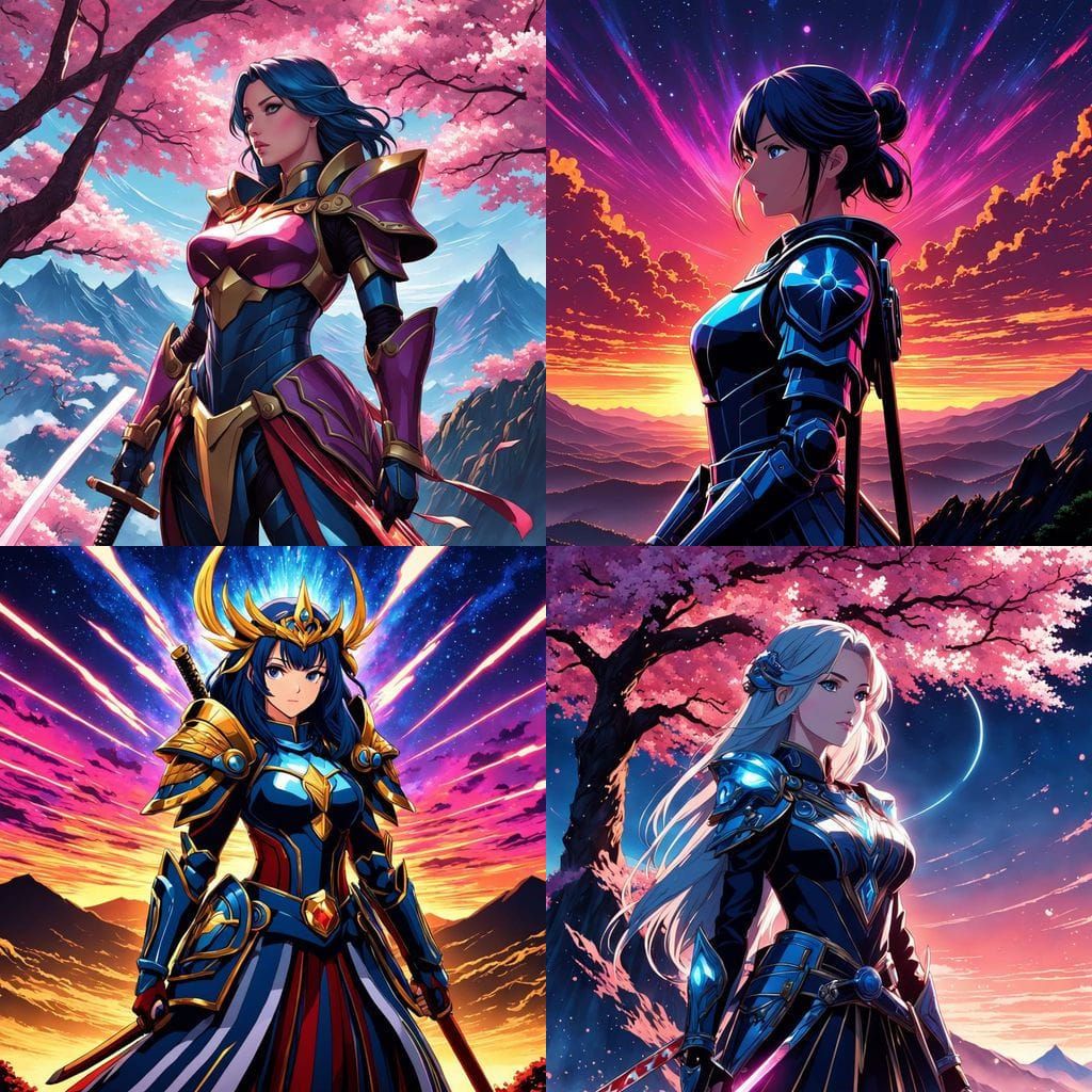 She is clad in ornate, elemental armor, wielding a katana that crackles with cosmic energy. The surrounding landscape is a fusion of cherry blossom trees and galactic vistas, creating a breathtaking scene of natural and celestial beauty.