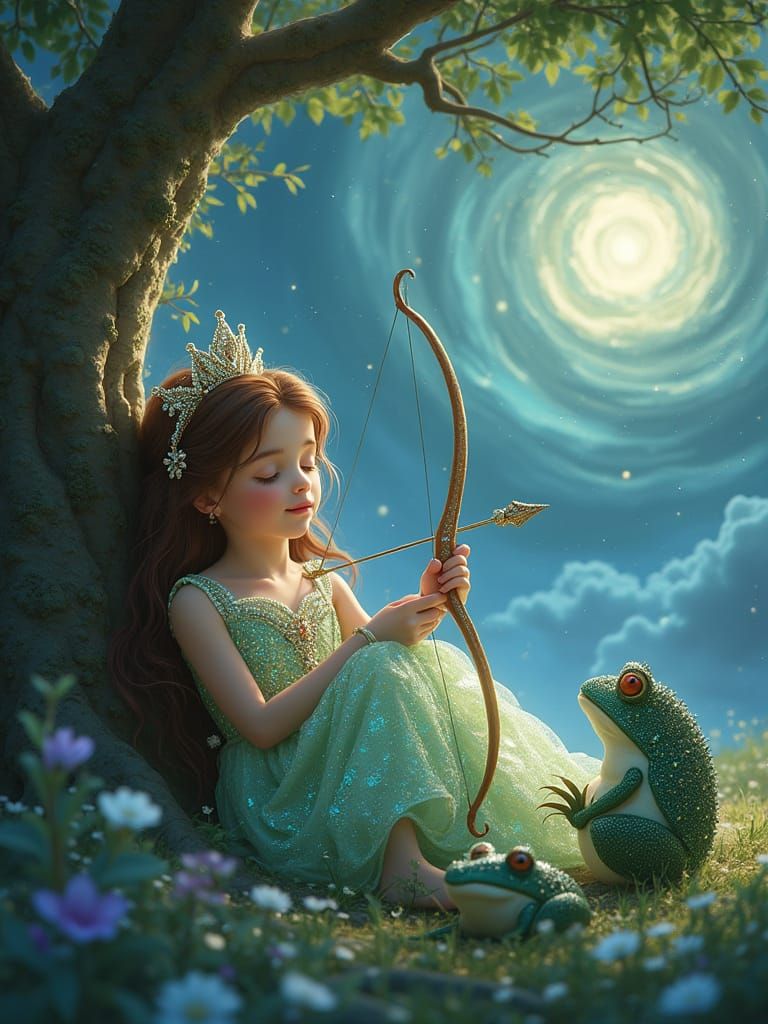 This image depicts a serene princess sleeping under a majestic tree, surrounded by two frogs with iridescent skin, amidst a soft, ethereal glow. The atmosphere is reminiscent of Art Nouveau and surreal cosmic illustrations, with a subtle astral landscape in the background.