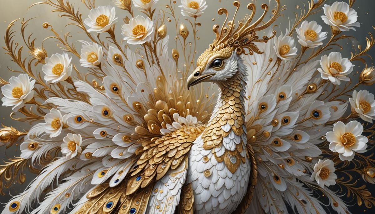 This image shows a stunning white and gold peacock dragon with elaborate floral feathers and glowing particles. The image is a highly detailed oil painting.