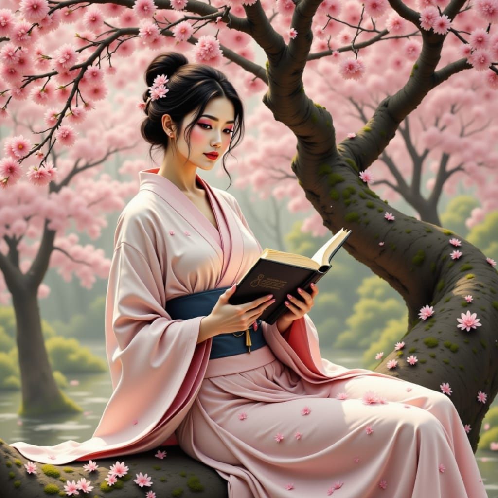 This image features a highly detailed, realistic portrayal of a Japanese woman warrior in a kimono, reading a book under a cherry blossom tree. The scene uses soft pastel colors and a lo-fi aesthetic, evoking Japanese ink brush art.