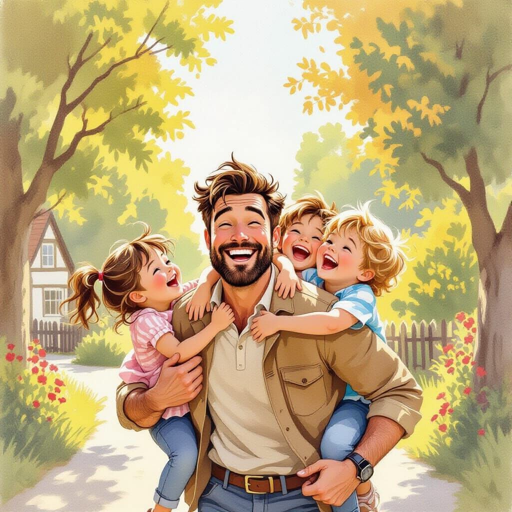 A heartwarming scene of a father giving piggyback rides to his laughing children. The sunny outdoor setting evokes a whimsical, illustrative style reminiscent of classic children's book art.