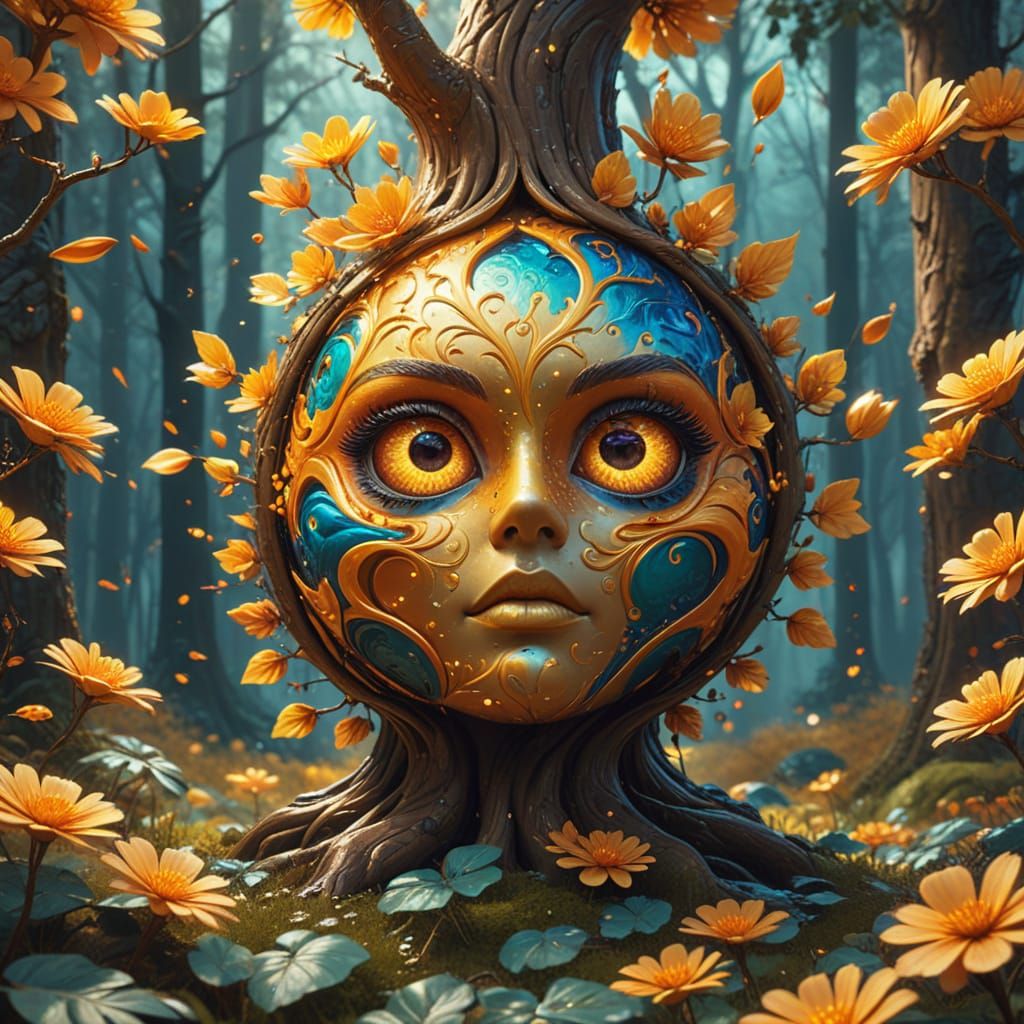 This image showcases a surreal popart illustration of a tree with glowing flowers, set against a swirly forest background, with bold brushstrokes and dynamic lighting, blending fantasy and hyper-realism.