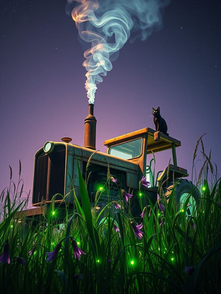A surreal masterpiece featuring a rusted junk metal tractor sculpture overflowing with glowing wildflowers, set against a backdrop of neon-hued, bioluminescent grasses. A kitten gazes skyward amidst celestial night glories and swirling smoke.