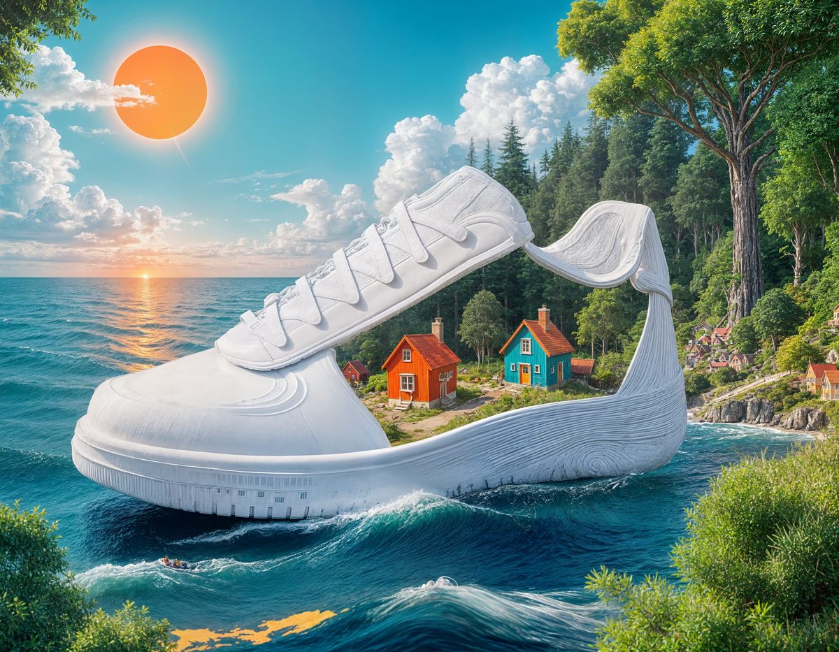This image showcases white, modern sneakers with a double exposure effect, blending a fantasy world of colorful village houses, a deep blue sea, and lush green forests.