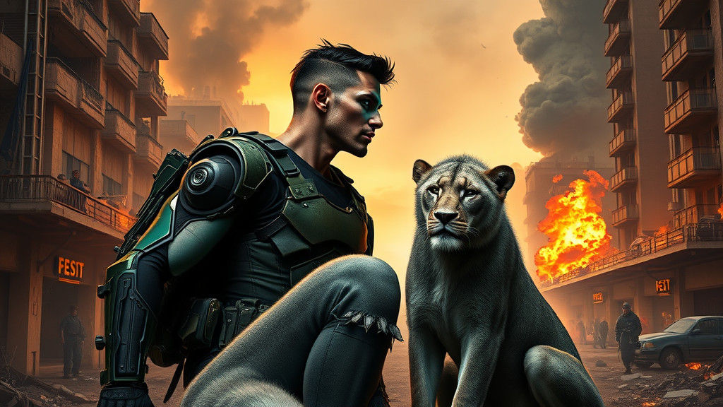 A captivating image of an alien woman with emerald hair kissing a human man amidst chaos. A gray lion watches nearby. The scene is set in a war-torn cityscape, rendered with gritty realism.