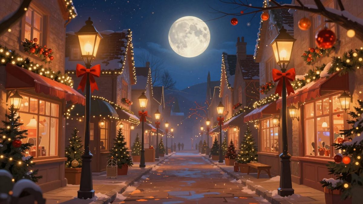 Generate your own charming Christmas street images, complete with decorations and warm lights. It's free and easy!
