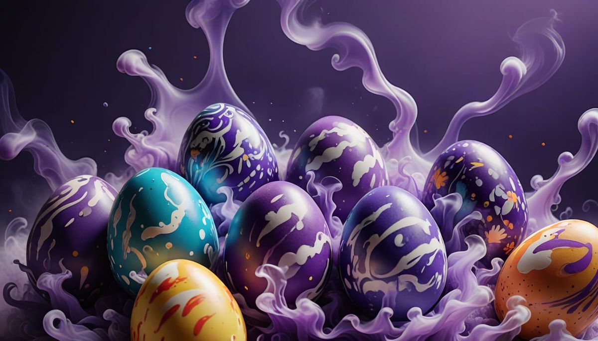 This stunning image showcases intricately decorated Easter eggs suspended in mid-air, surrounded by wispy purple smoke and vibrant colors, creating a hyperrealistic and dramatic scene.
