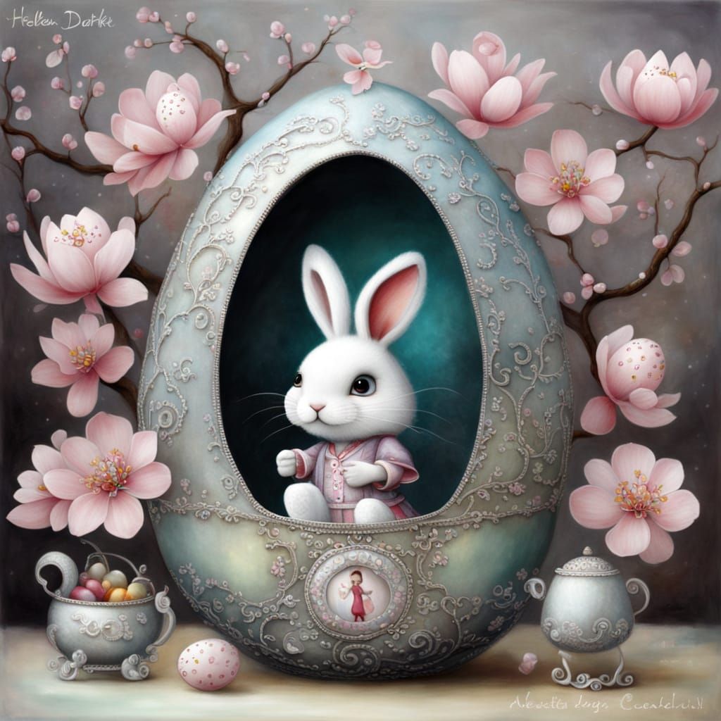 This image is a vibrant depiction of Easter, featuring a stunning silver Fabergé egg amidst cherry blossoms, with a whimsical rabbit at its center, created in a bold impasto style reminiscent of Nicoletta Ceccoli's imaginative works