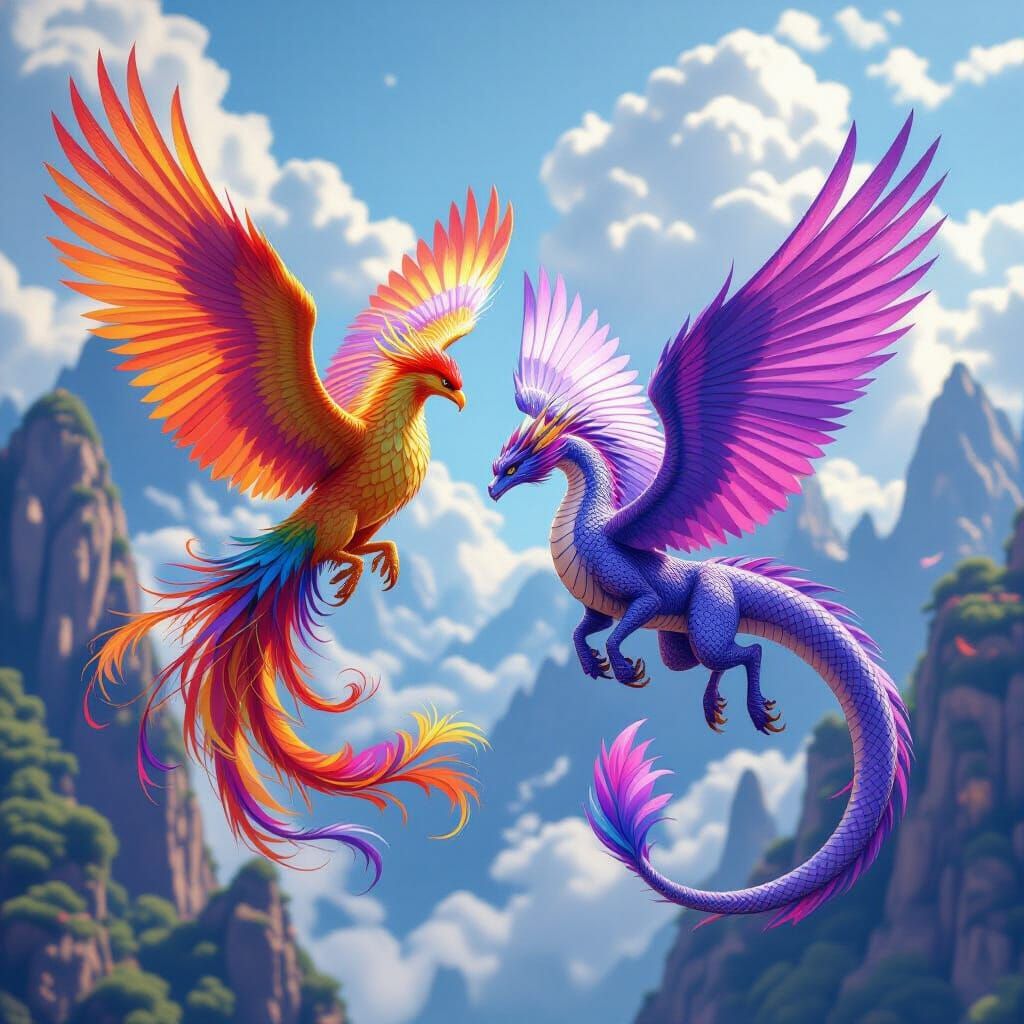 This image shows a vibrant rainbow phoenix soaring beside a majestic purple dragon. Rendered with intricate detail in a 3D anime style, the image evokes a breathtaking and realistic digital painting.