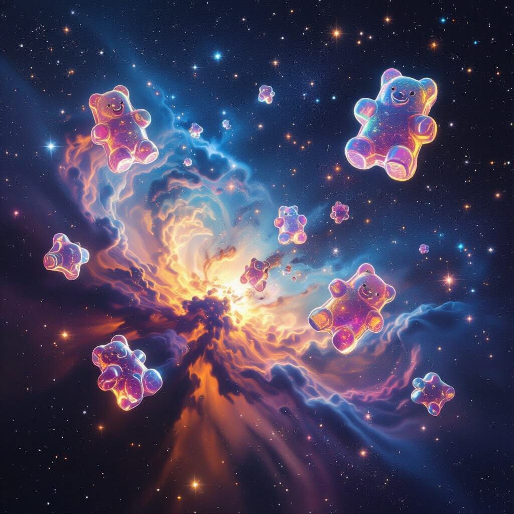This image shows giant gummy bears floating through a vibrant cosmic nebula, rendered in hyperrealistic detail with volumetric lighting and deep blues and purples.