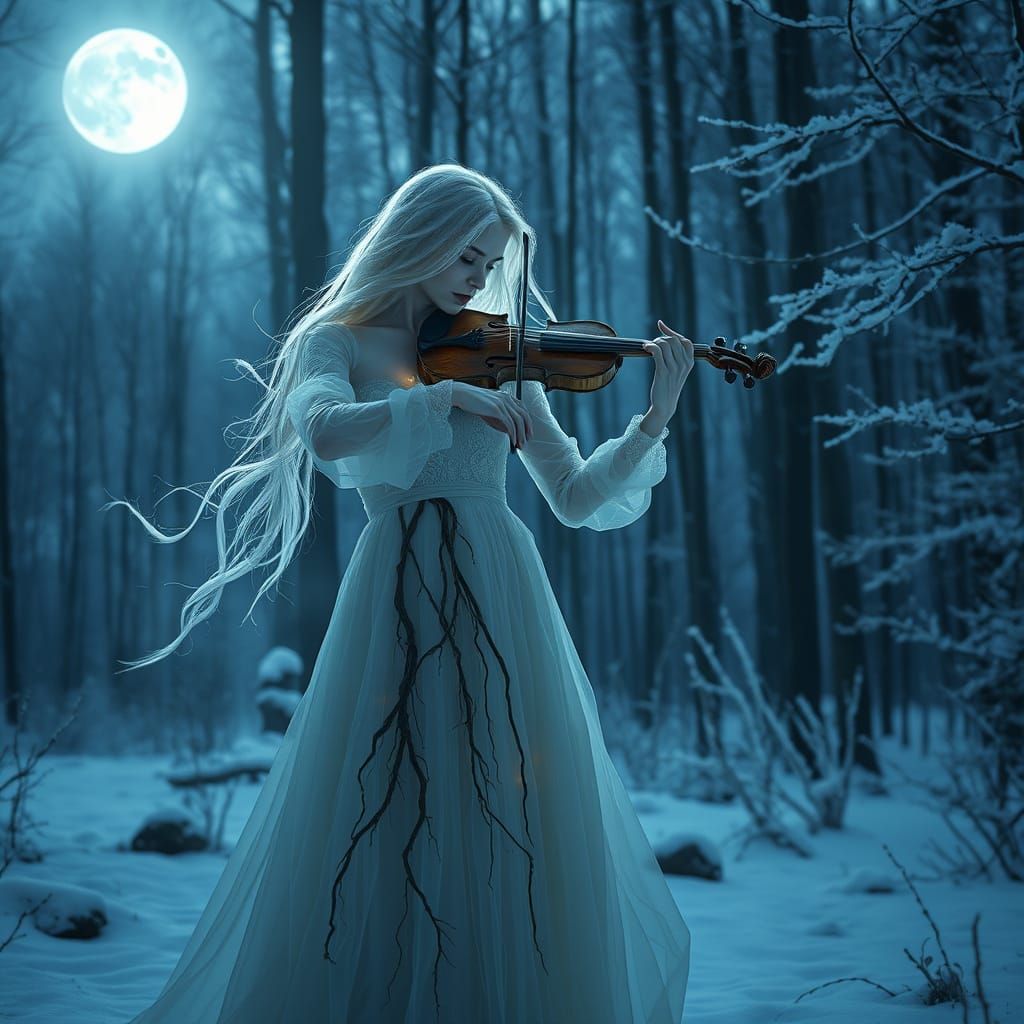 A translucent spectral woman plays a root-wood violin in a snowy forest under moonlight. Ethereal mist and glowing motes create a sorrowful, dreamlike atmosphere with cinematic lighting.