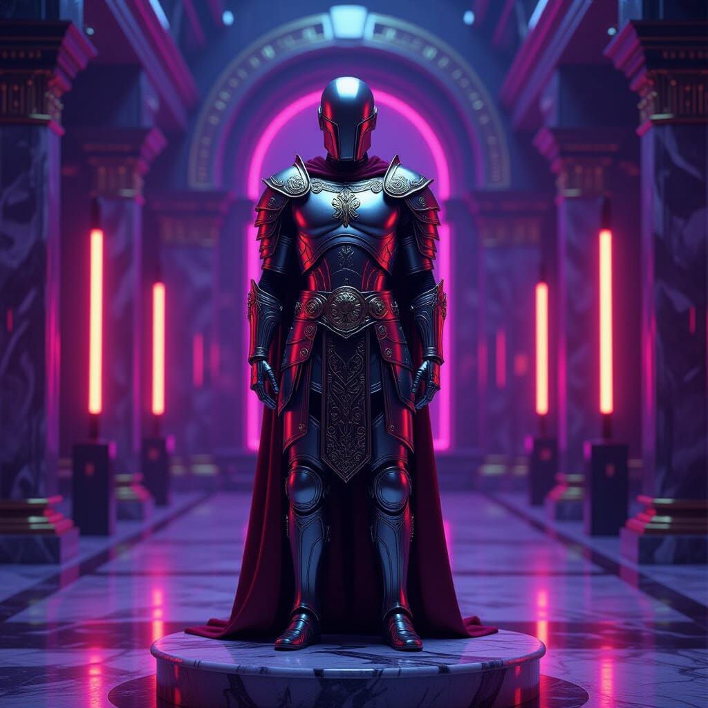 This image shows an android Roman emperor in metallic armor on a pedestal. The futuristic scene features purple, red, and gold colors, neon lights, and chrome, creating a high-tech yet nostalgic ambiance.