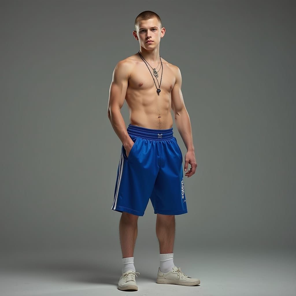 A fit and tough young man with a rugged physique, wearing blue Adidas sportswear and dog tags, set against a gritty realistic background with a focus on vibrant colors and dynamic posing.