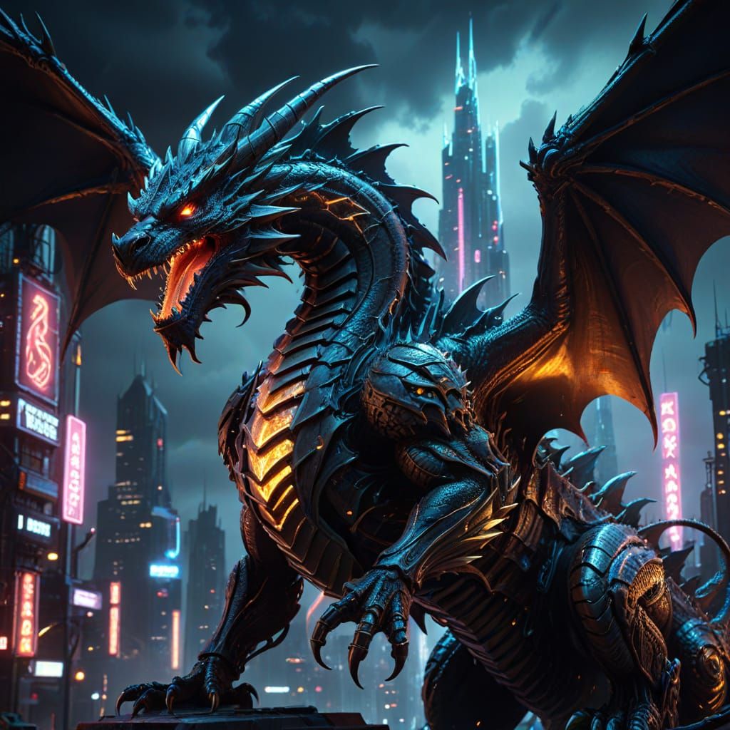 This hyperrealistic concept art depicts a massive biomechanical dragon wrapped around a crystalline city spire, illuminated by vivid neon lights in a dark, cyberpunk style.