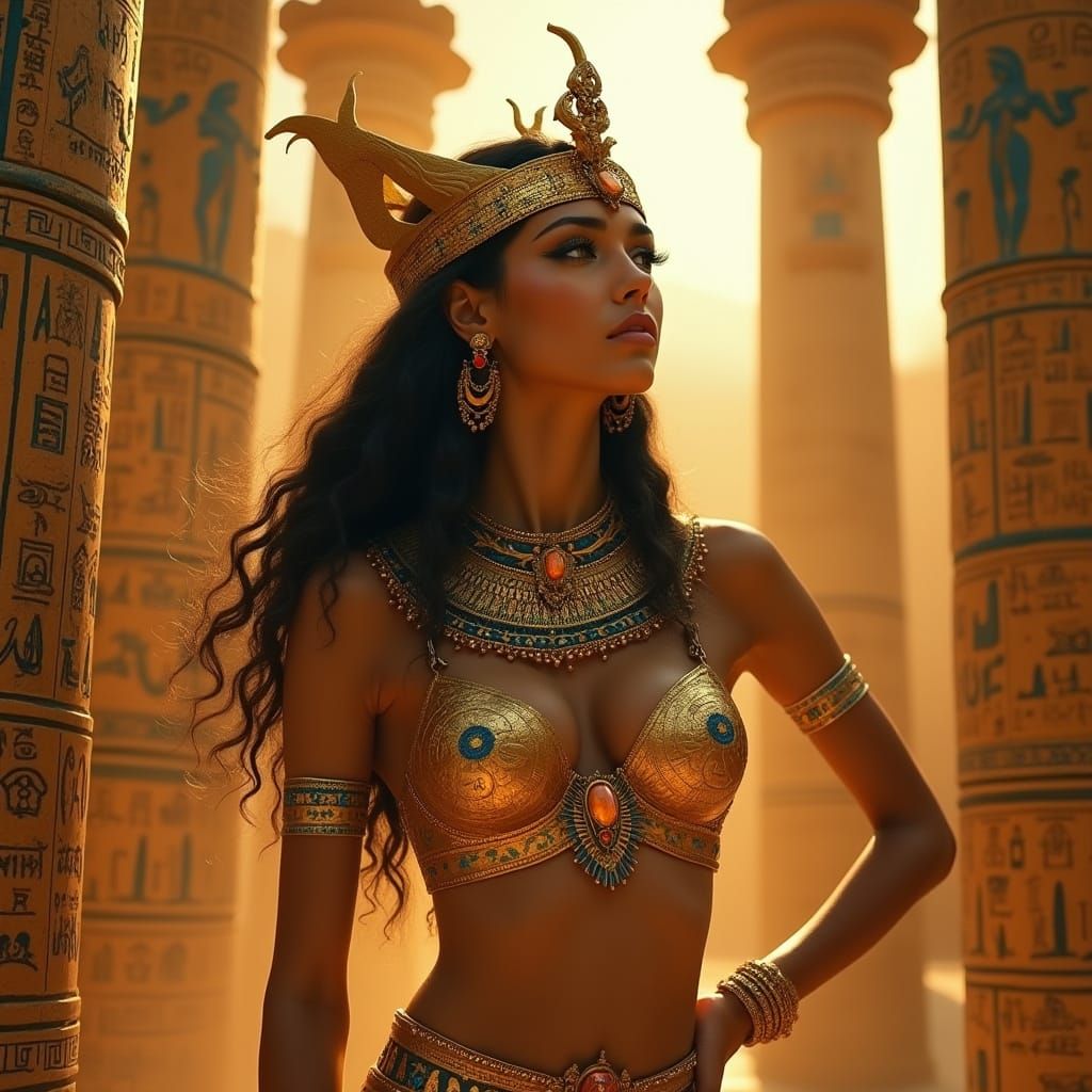 This image shows a regal Egyptian goddess standing in a sun-drenched temple, surrounded by intricate hieroglyphics and adorned with gleaming golden jewelry and vibrant gemstones, in a style that blends the opulence of ancient Egyptian art with the mystical quality of dreamlike landscapes.