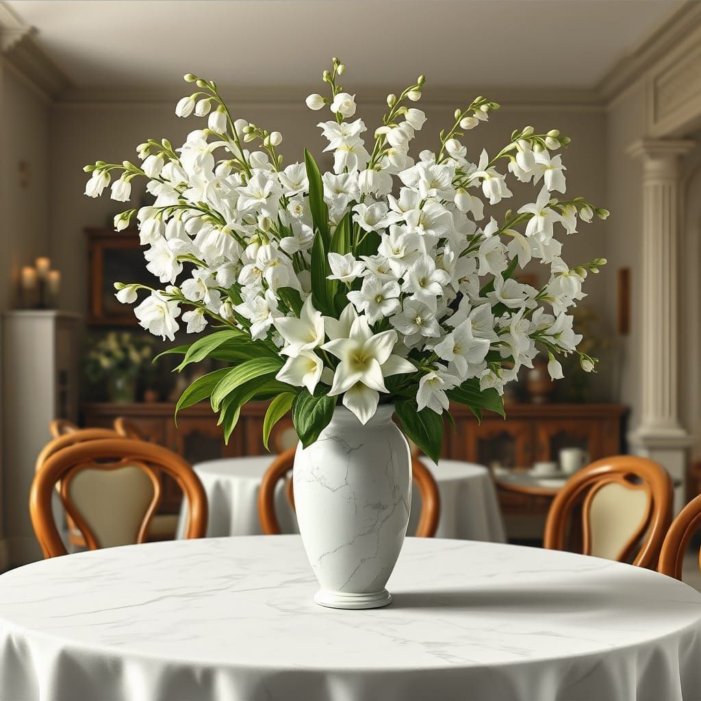 This image showcases a white marble vase brimming with various white flowers. The scene is rendered in a surrealist style with a matte, misty background, evoking ethereal fantasy and bright, soft lighting.