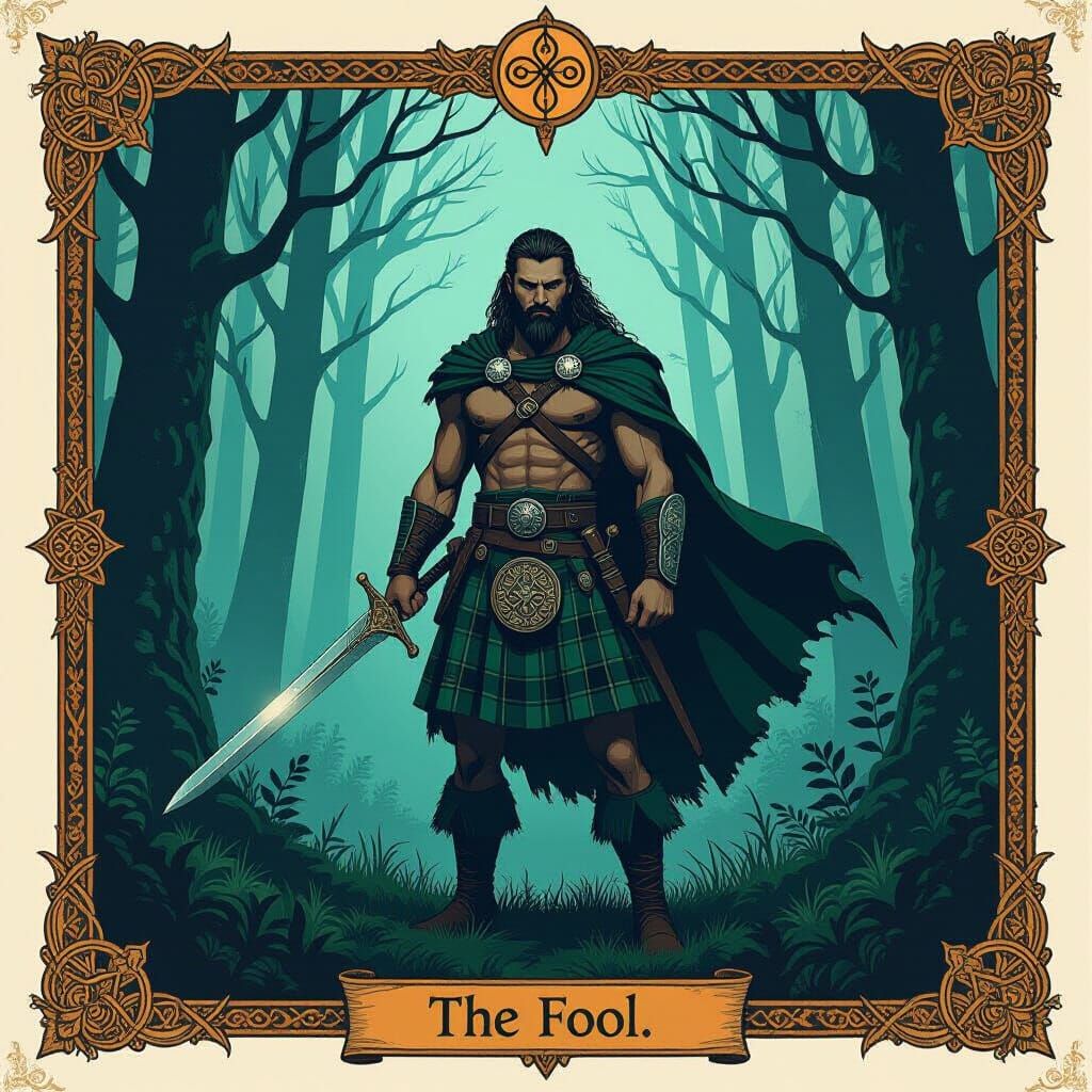 A striking picture of an Irish warrior in a kilt amidst Celtic nature, decorated with Druid symbols. The figure stands at a mystical forest's edge, embodying 'The Fool' in a dark art style.