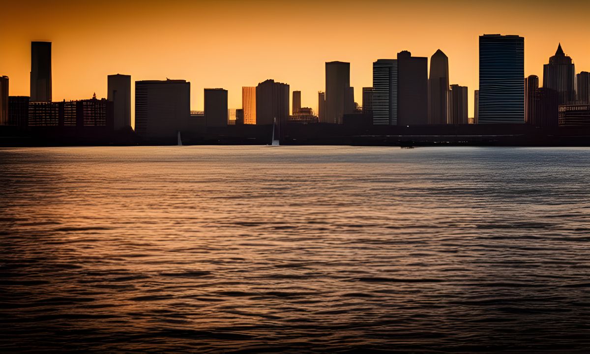 A breathtaking cityscape reflecting on the water at sunset. The professional photograph features a soft bokeh effect, natural lighting, and sharp focus, captured with a high-resolution DSLR camera.