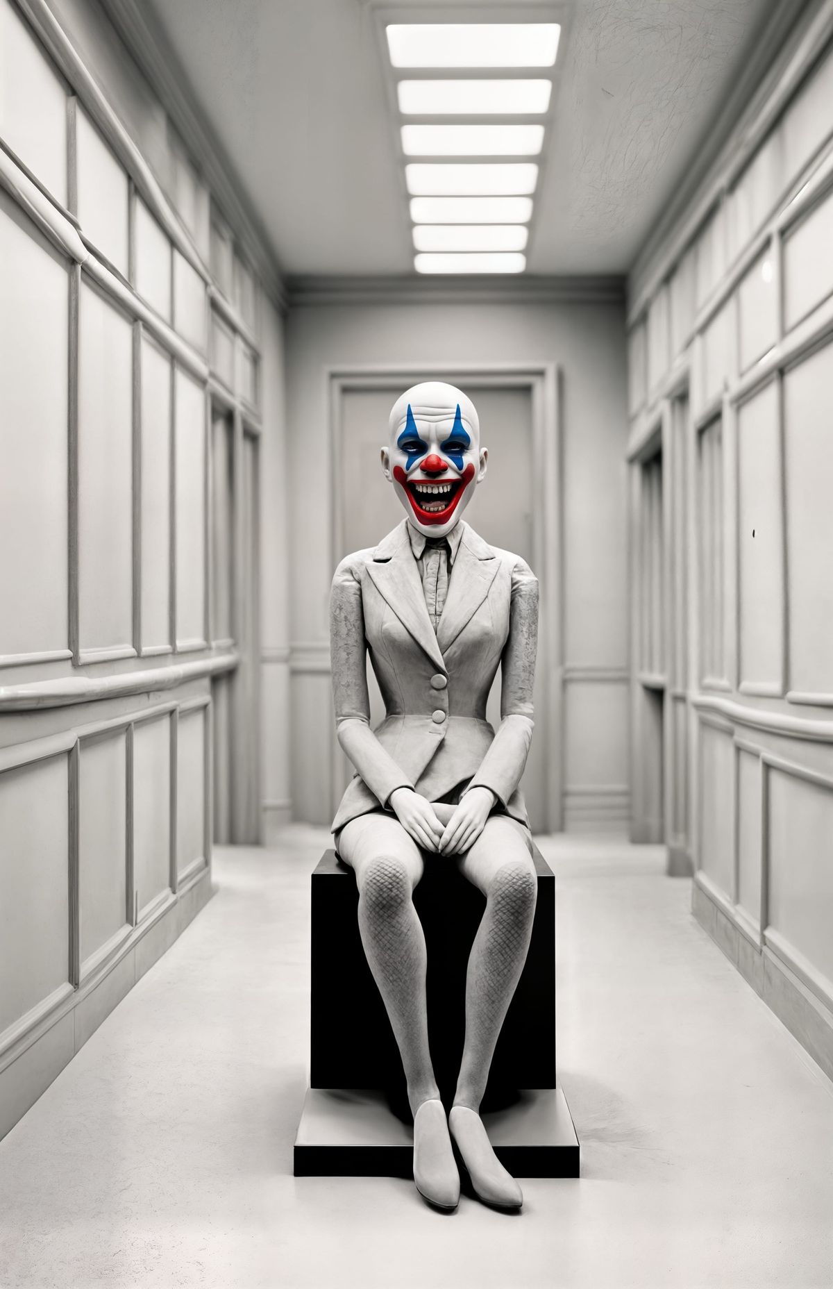 This fine art monochrome photograph features a mannequin with a painted grin, encased in a porcelain suit within a minimalist hallway. Captured with long exposure techniques.