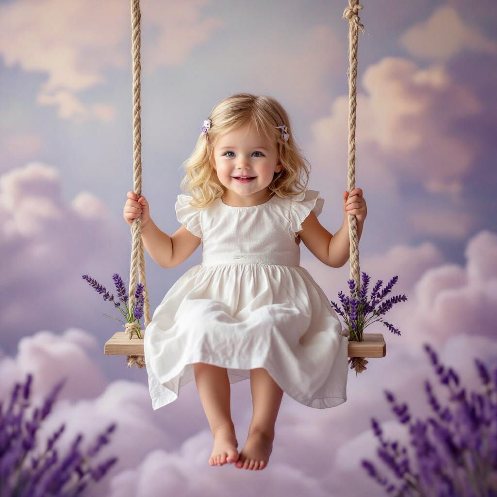 This photorealistic image shows a young girl in a white dress on a lavender-adorned swing, floating above soft, tinted clouds. Captured with a 50mm lens, it features a dreamy glow and high detail.
