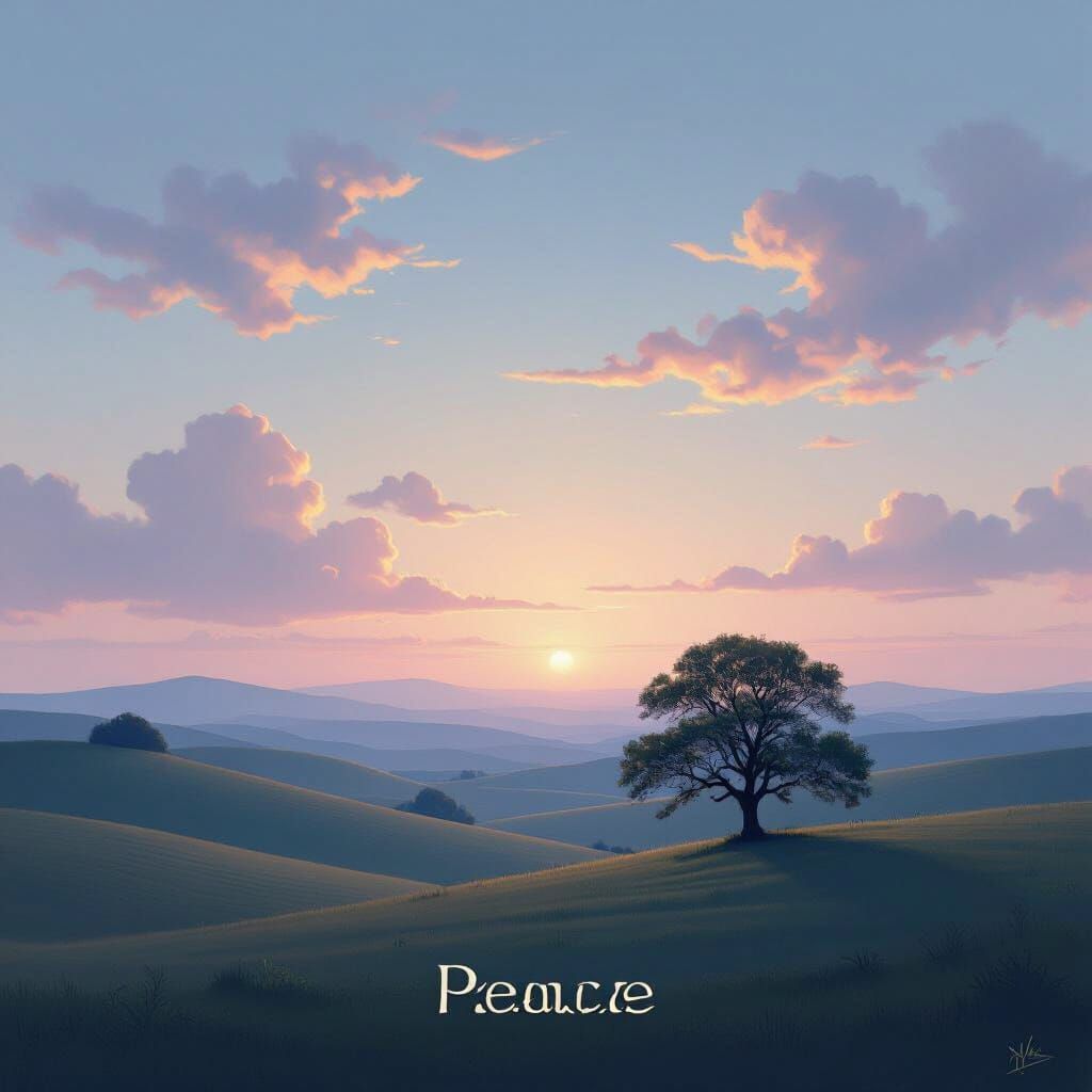 This image features a tranquil album art cover with rolling hills and a twilight sky. An ancient tree is the focal point, rendered in an atmospheric, luminous digital matte painting style.
