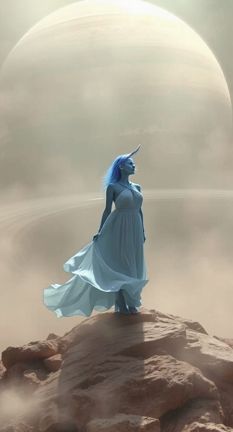 This image shows a blue-toned centaur. The AI-generated artwork depicts a female centaur, with a horse's body and a woman's torso, rendered in shades of blue.