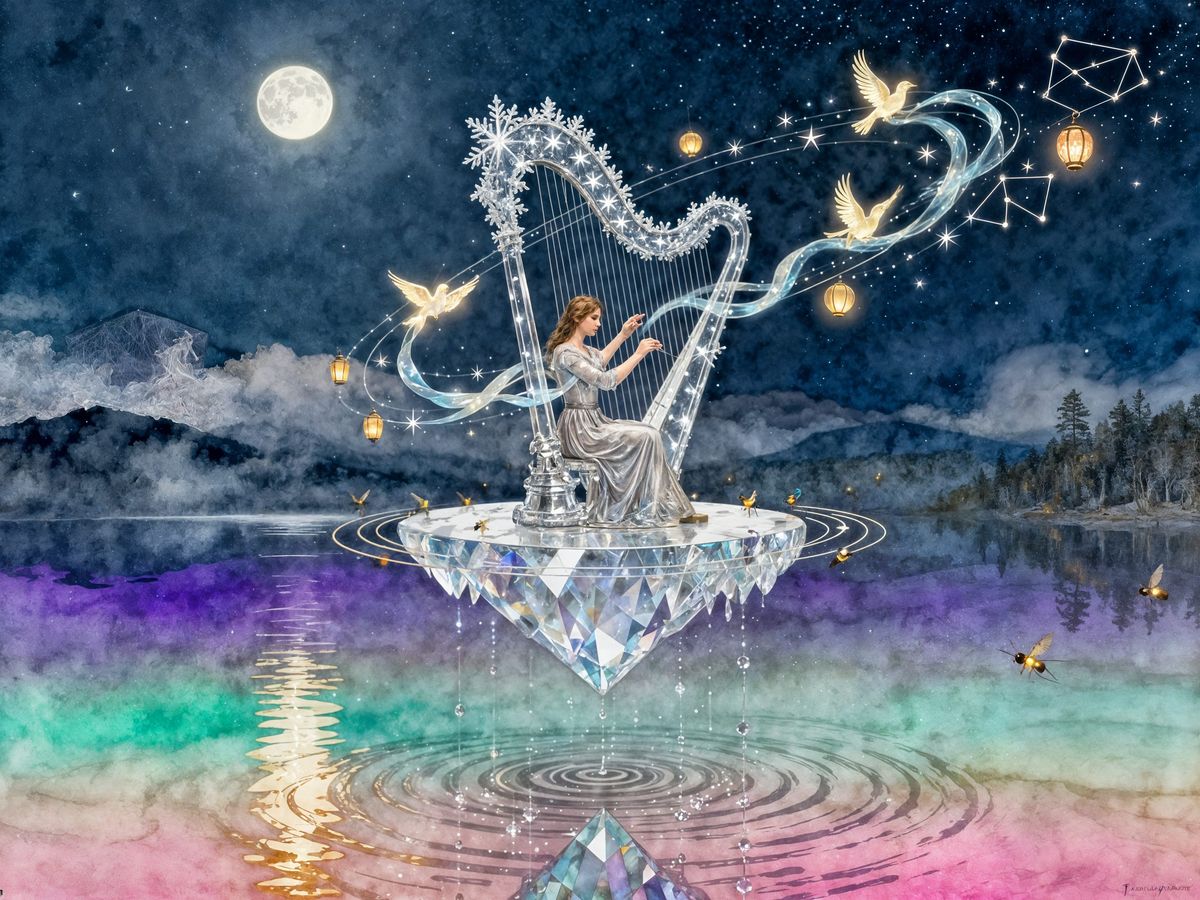 The Luminant Composer. On a floating stage carved from translucent crystal, drifting just above a still moonlit lake, a lone musician performs. They play a silver-stringed harp whose frame shimmers like frost-kissed starlight. Each plucked note materializes into shimmering magic — luminous ribbons that ...