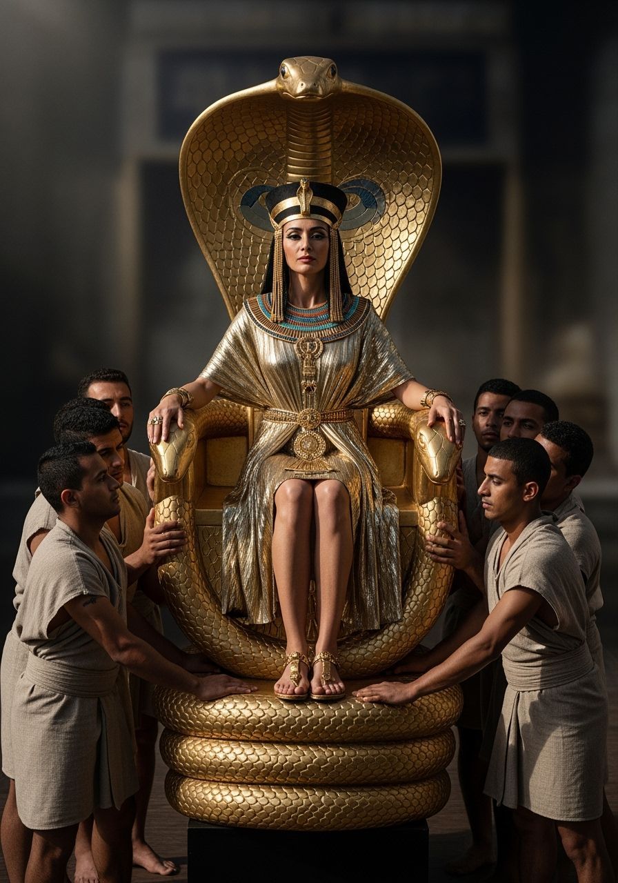 A striking picture of an Egyptian queen on a cobra throne. Carried by twelve servants, she wears golden jewelry and a toga. Soft light creates dramatic shadows and highlights in this stylized photograph.