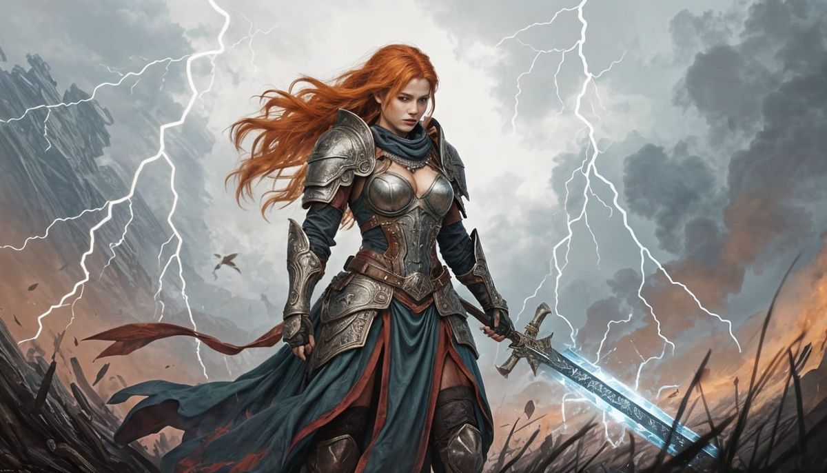 A dynamic image of a red-haired valkyrie on a battlefield. She's armored and holds an energy-infused sword amid crackling lightning. The abstract style features layered textures, ink patterns, and bold colors.