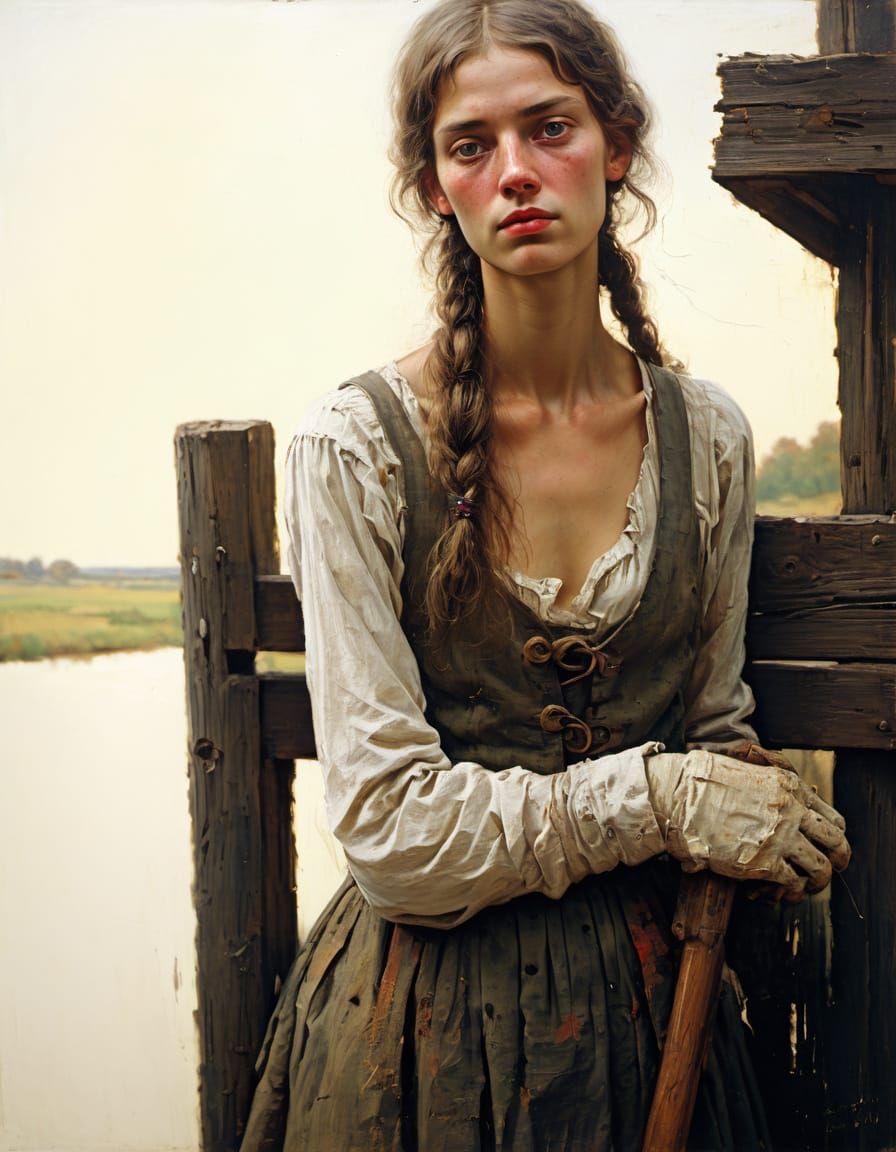 Claudine à la capeline - Post Impressionist Portrait Oil Painting by Marcel Dyf, Frau beautiful eyes, charming Old vintage German realism, 19th-century rural genre art, painted in the style of Anton Heinrich Dieffenbach, Jan Hendrik Verheijen A richly textured oil-on-canvas scene using hard palette knife ...