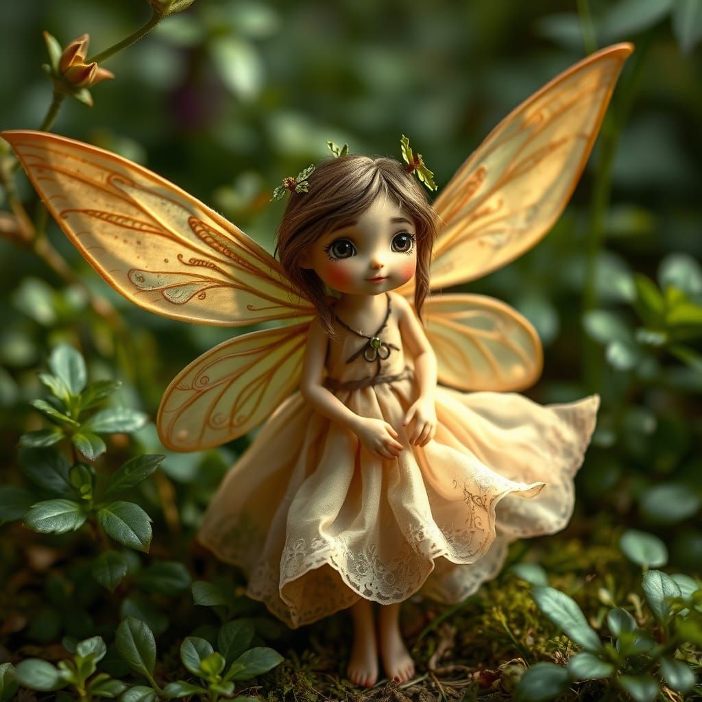 This image shows a whimsical potato fairy with delicate wings and a flowing dress, amidst lush greenery. The artwork features intricate details and soft, ethereal lighting, reminiscent of fantasy art.