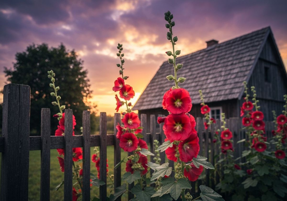 A peaceful image of vibrant red hollyhocks blooming against a weathered barn and fence at sunset. Warm golden light and soft purple clouds fill the sky in this idyllic countryside scene.
