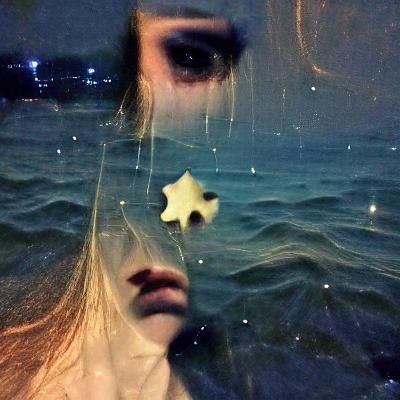 This image shows a melancholic scene of stars reflected on the sea. The surreal artwork creates a dreamlike atmosphere with a focus on texture and color.