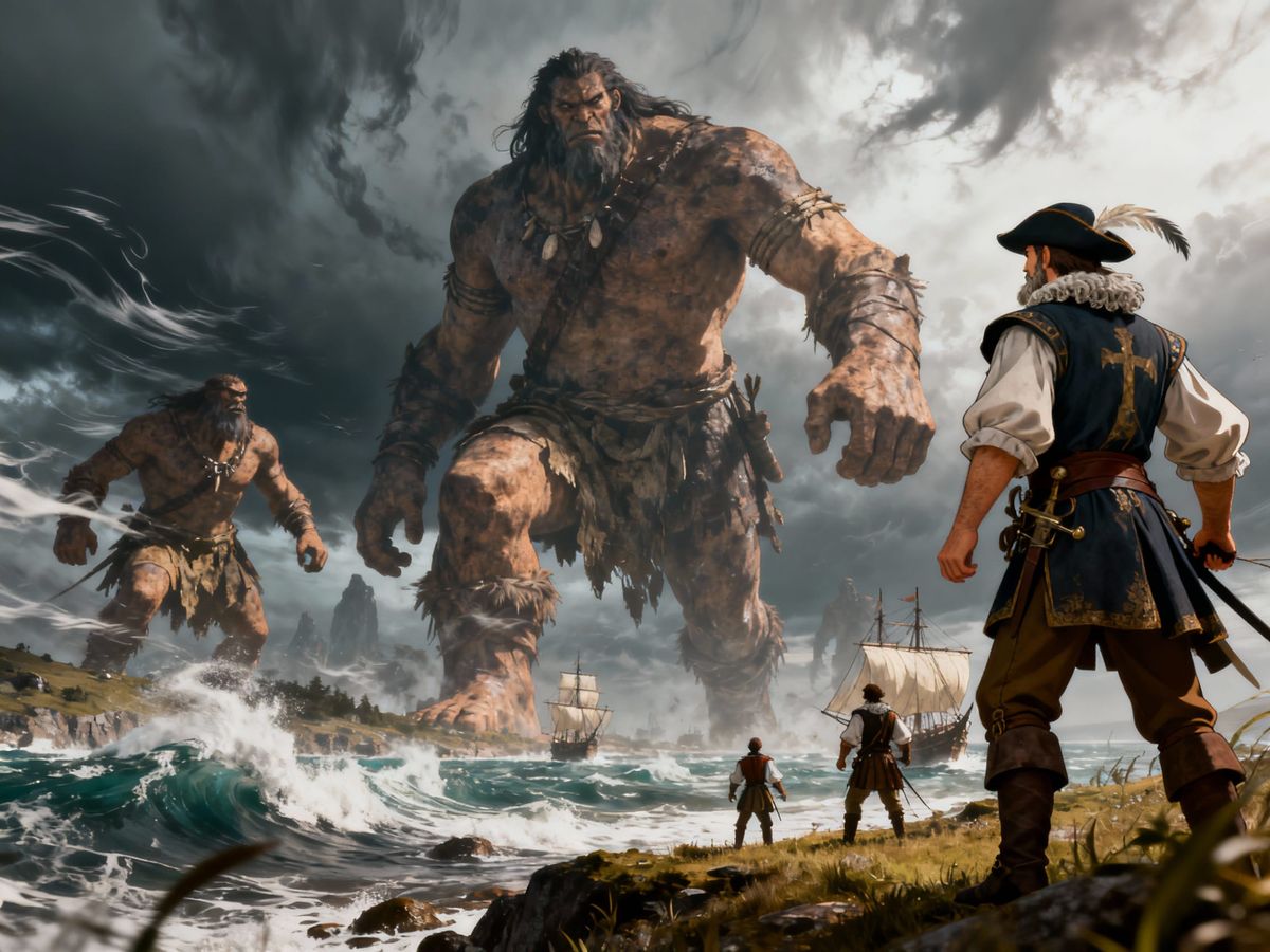 This image depicts Ferdinand Magellan and his crew encountering colossal Patagonian giants, rendered in a detailed 3D anime aesthetic with cinematic lighting.