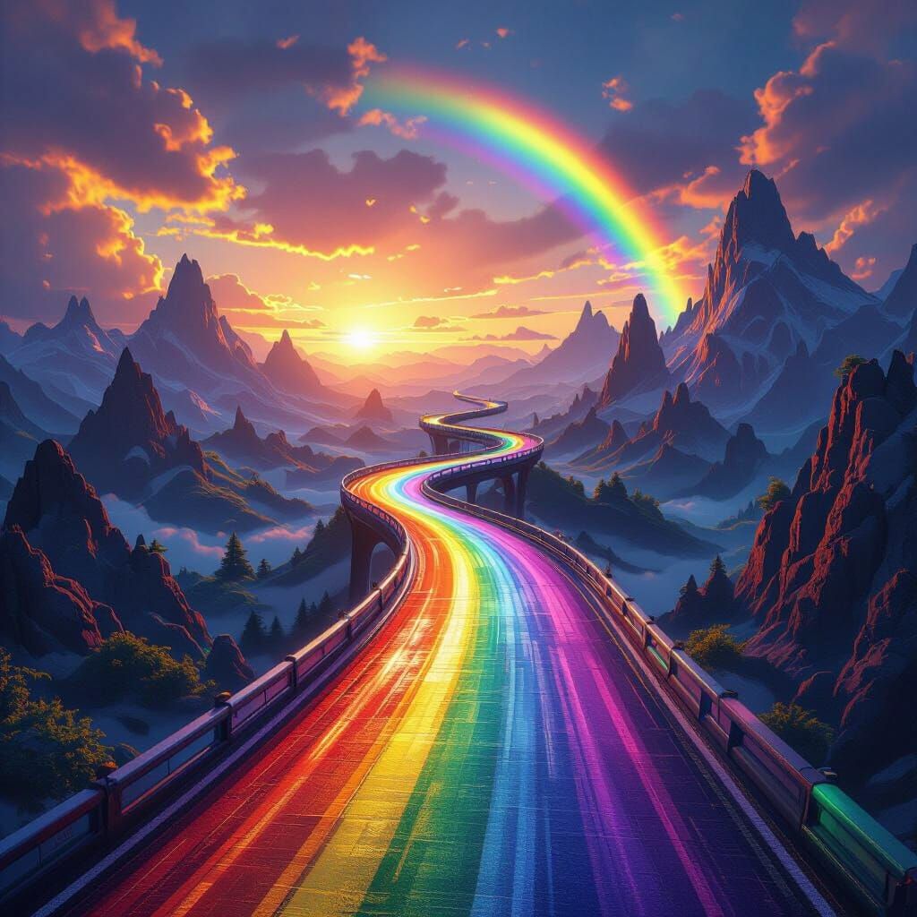 This image showcases The Rainbow Road as a fantastical matte painting. Deep, vibrant colors create an awe-inspiring scene, rendered in high detail with a professional fantasy art style.