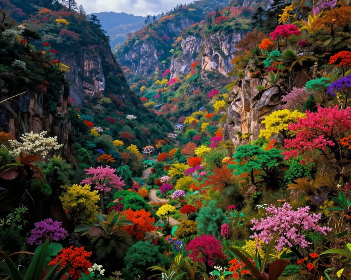This image showcases a hyperrealistic, vibrant Asian valley with ornate details. Its romantic landscape aesthetic features high contrast and saturated colors, rendered with cinematic lighting.