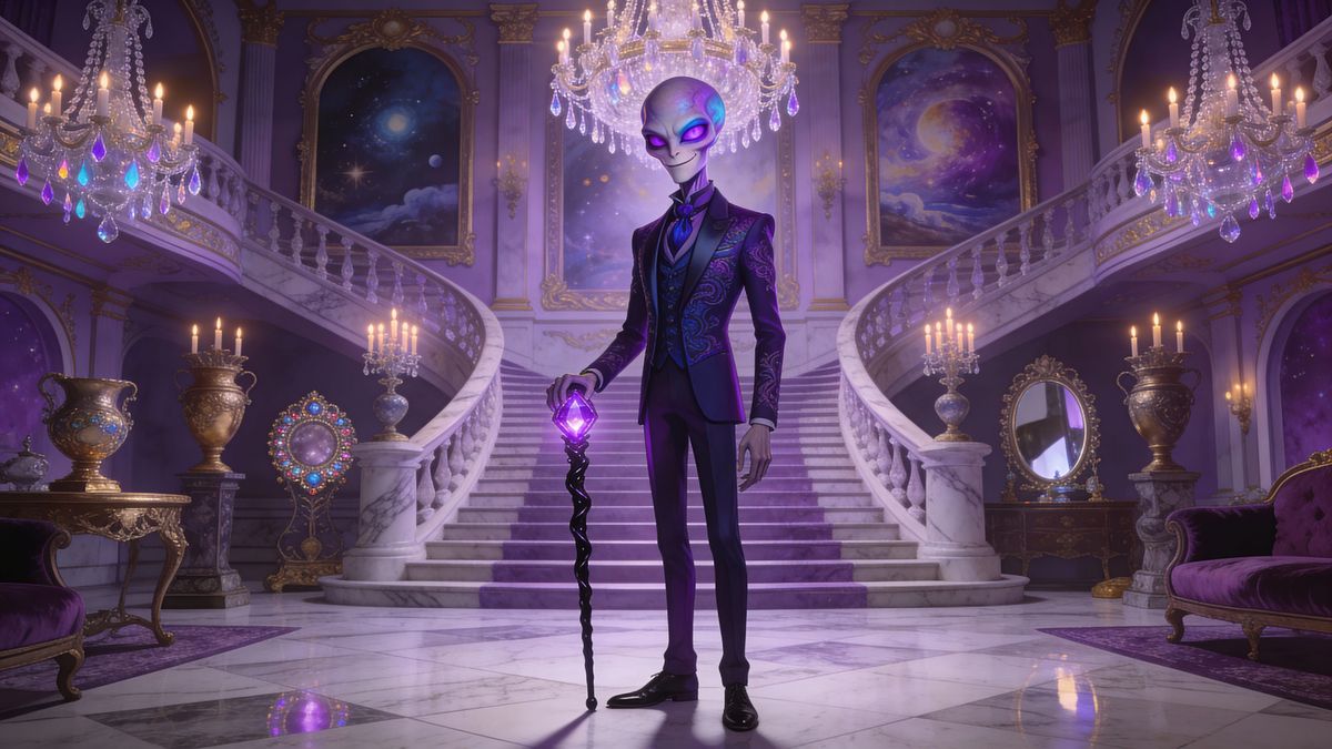 This image shows a hyperrealistic alien in a formal suit within a grand baroque palace. The scene features rich purple, lavender, and indigo tones, with opulent decor and a sinister yet playful atmosphere.