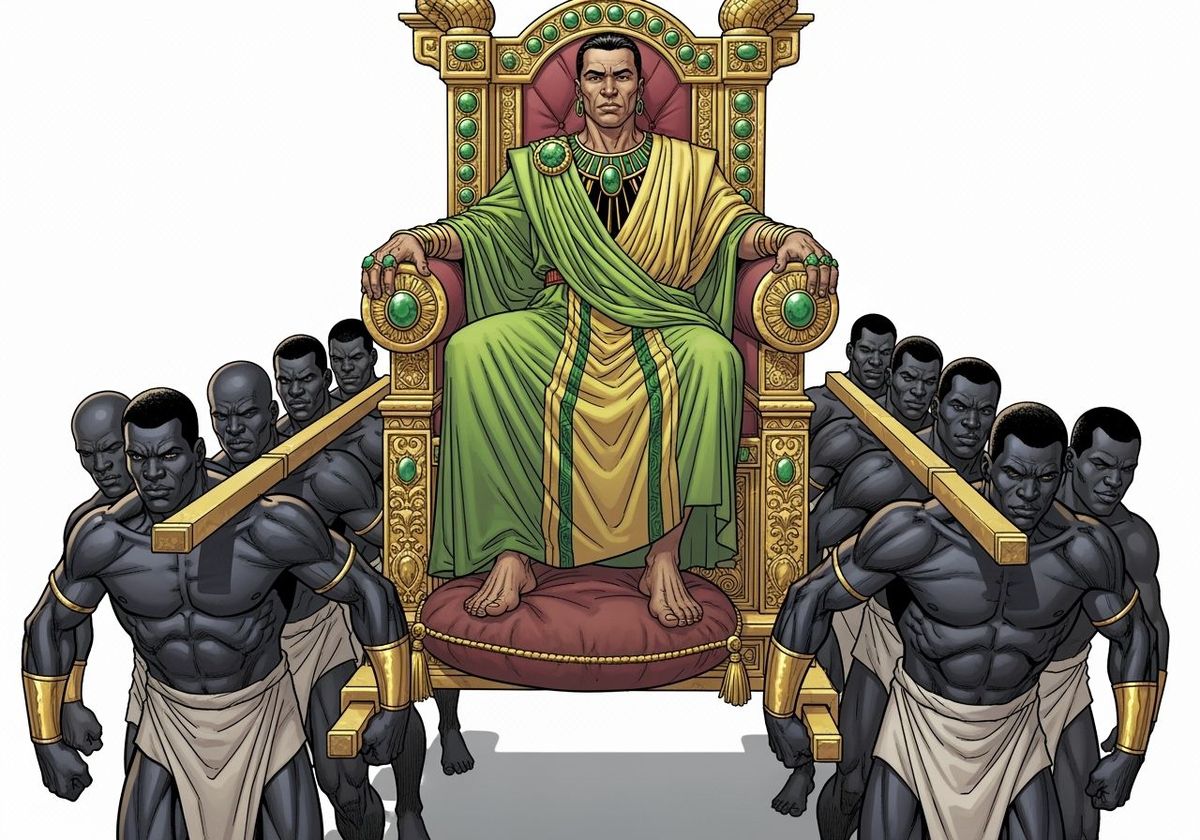 This image shows The Mandarin on a throne made of gold and emeralds. The throne is being carried by ten servants. He is wearing his ten rings and a green and yellow toga, in a comic book art style.