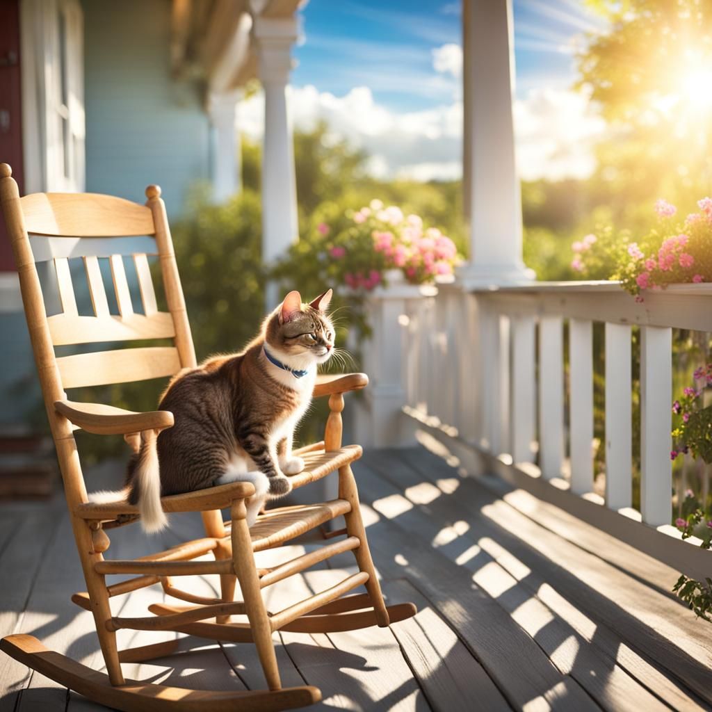 A sun-drenched image of a cat relaxing on a rocking chair on the porch of a beach cottage, bathed in soft, heavenly light.