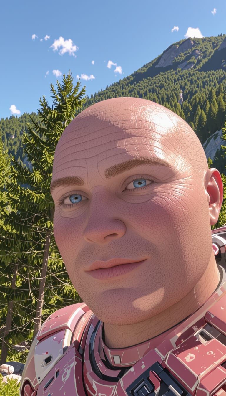 This image shows a proud, bald space marine with blue eyes, depicted in ornate power armor. The art style blends gritty realism with sci-fi futurism.