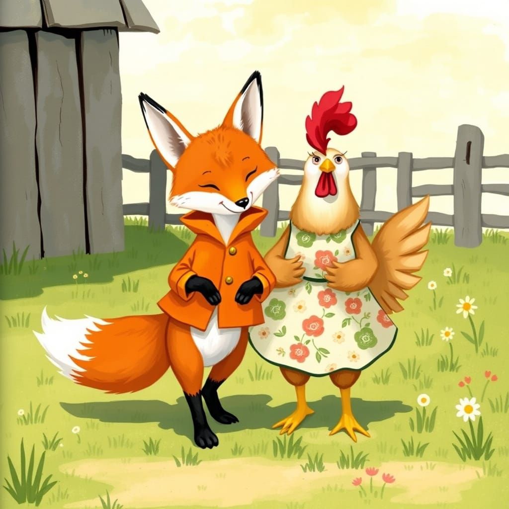 This image shows a fox in an orange jacket and a hen in a floral apron playing like friends in a sunny farmyard, inspired by whimsical illustration styles.