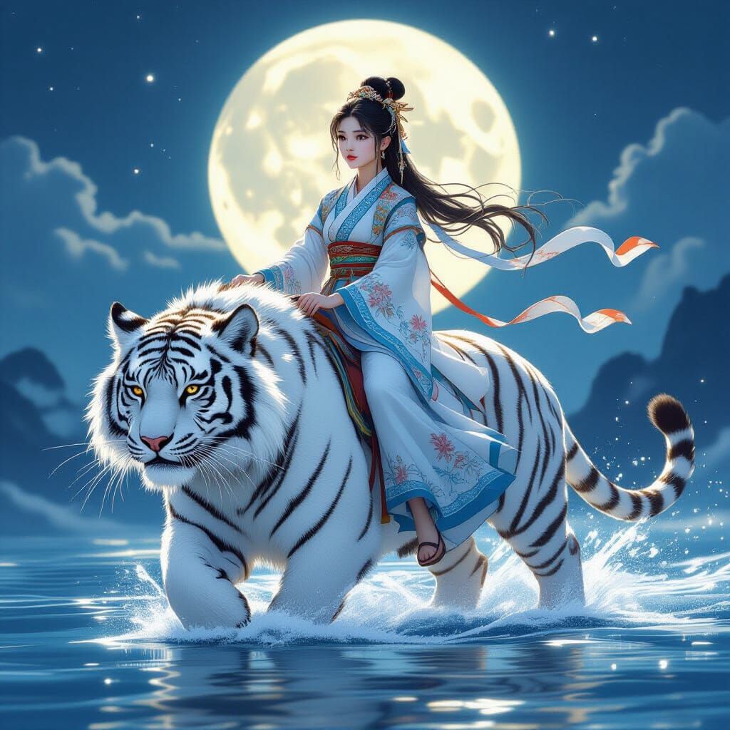 This image shows a beautiful girl in traditional Hanfu, riding a white tiger walking on water under moonlight. The scene has a realistic and detailed style, with subtle texture and shading.
