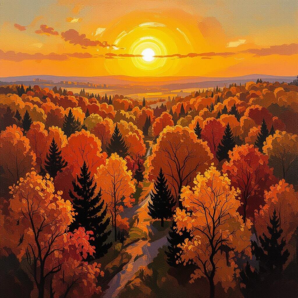 This image shows a vast forest with orange foliage, seen from above. The setting sun paints the sky in warm hues, illuminating the trees in an impressionistic style, reminiscent of classic landscape paintings.