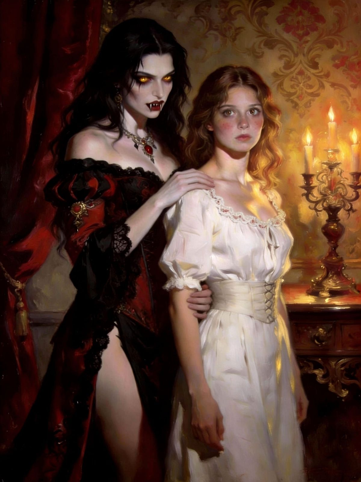 This oil painting captures a gothic vampire seducing a peasant woman in an opulent baroque chamber. The scene features rich velvet, flickering candlelight, and intense focus on the impending bite.