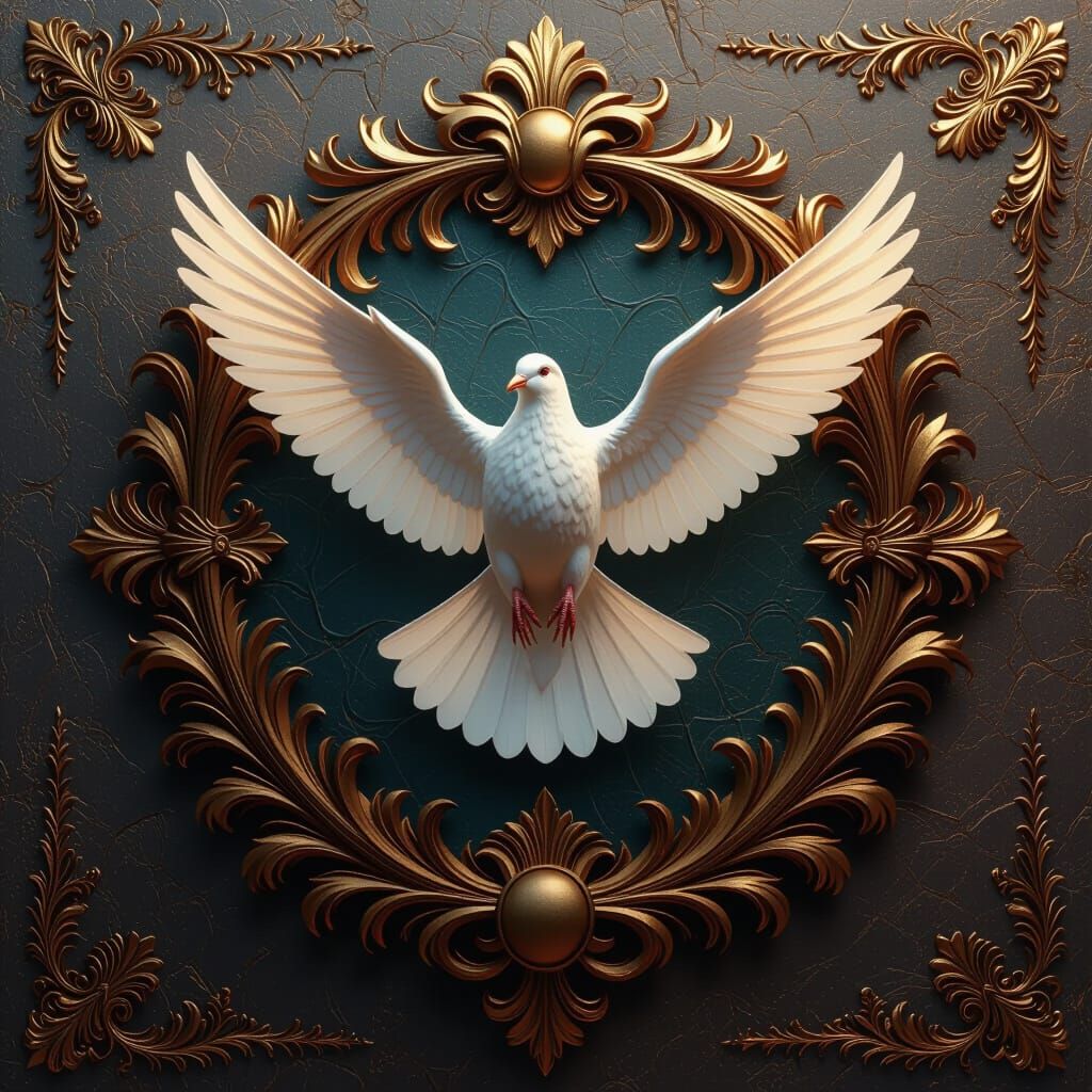 This image features a heraldic emblem of a dove in flight, symbolizing peace and the Holy Spirit. It is rendered in a detailed matte painting style with rich colors and a splash screen aesthetic.